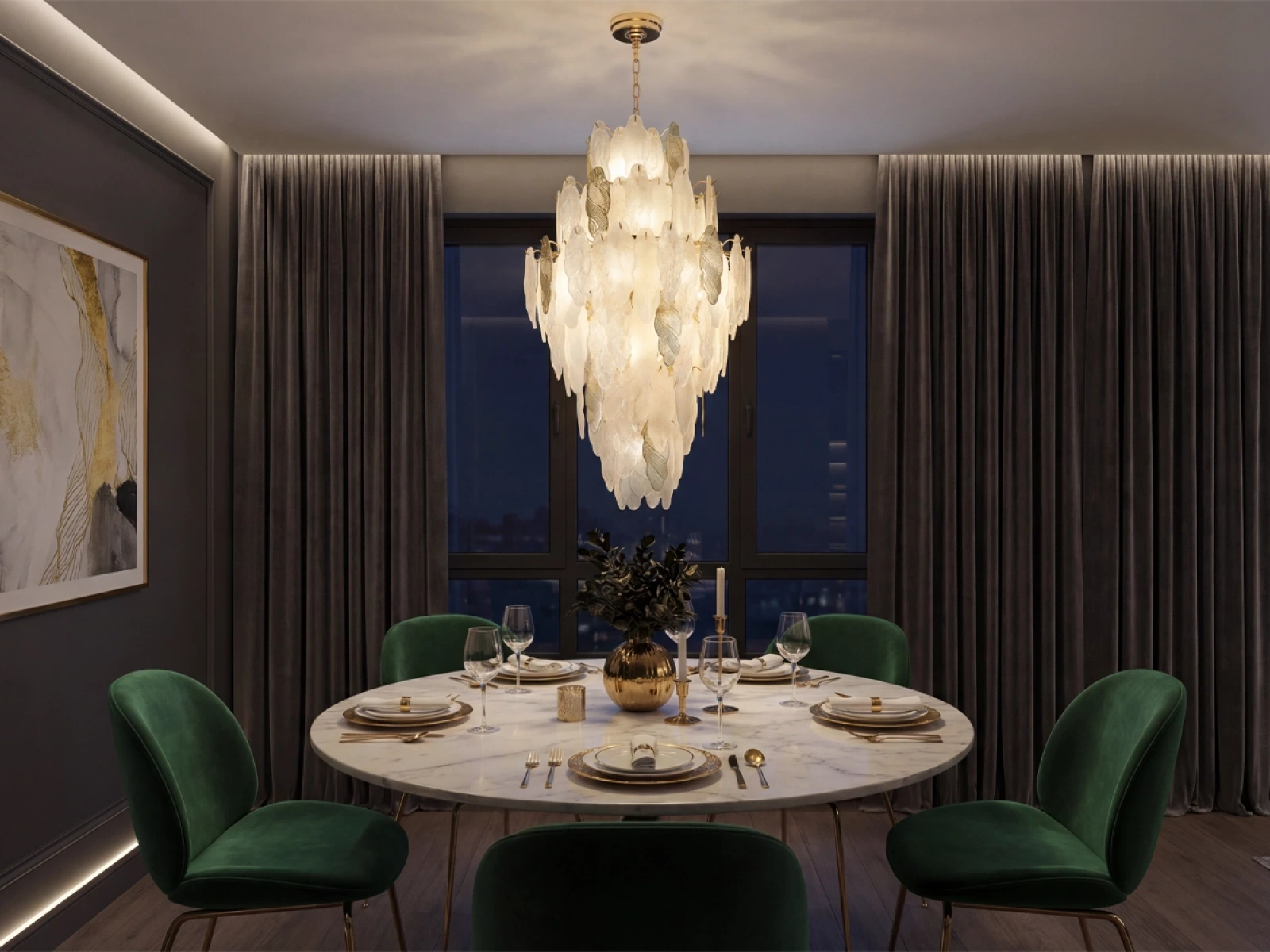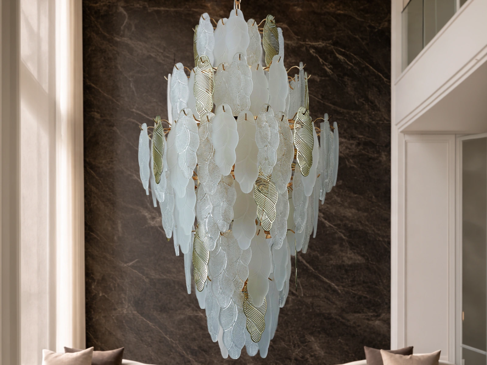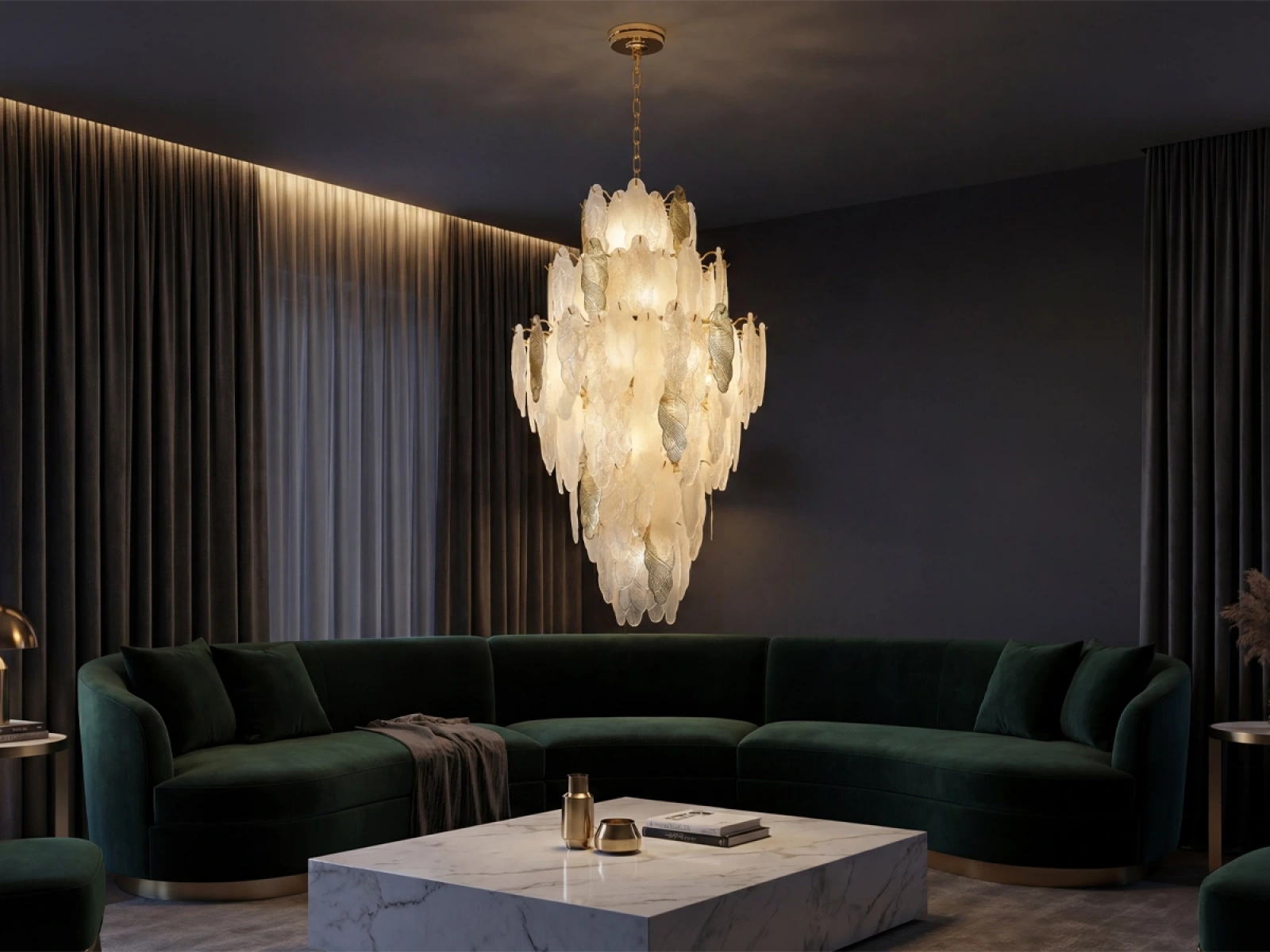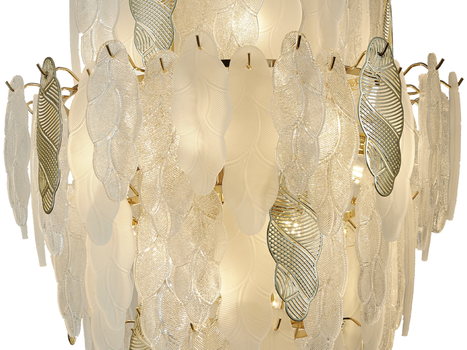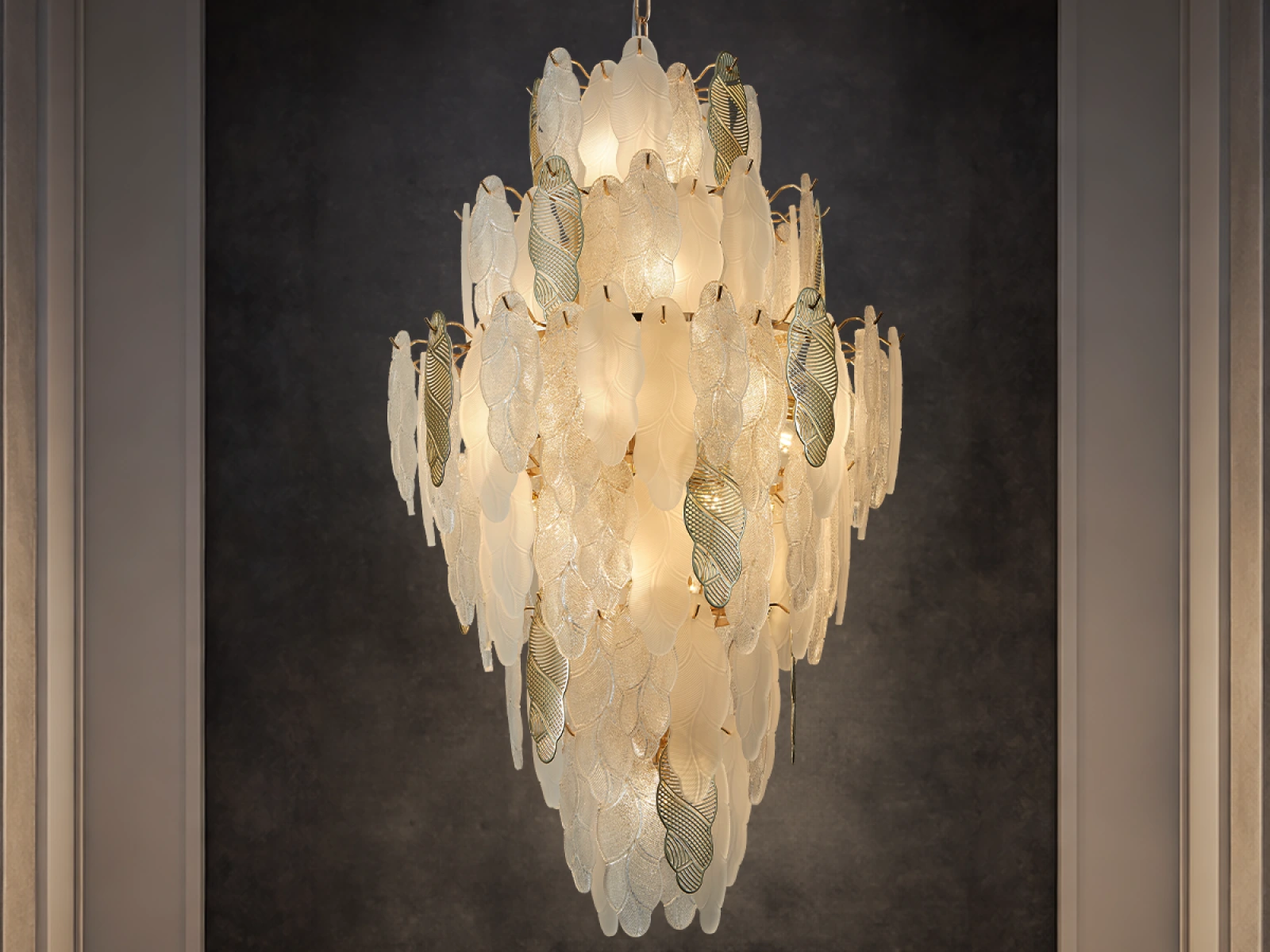 Jemná štruktúra sklenených prvkov v kombinácii s dekoratívnymi kovovými detailmi podčiarkuje luxusný a sofistikovaný charakter tejto kolekcie.