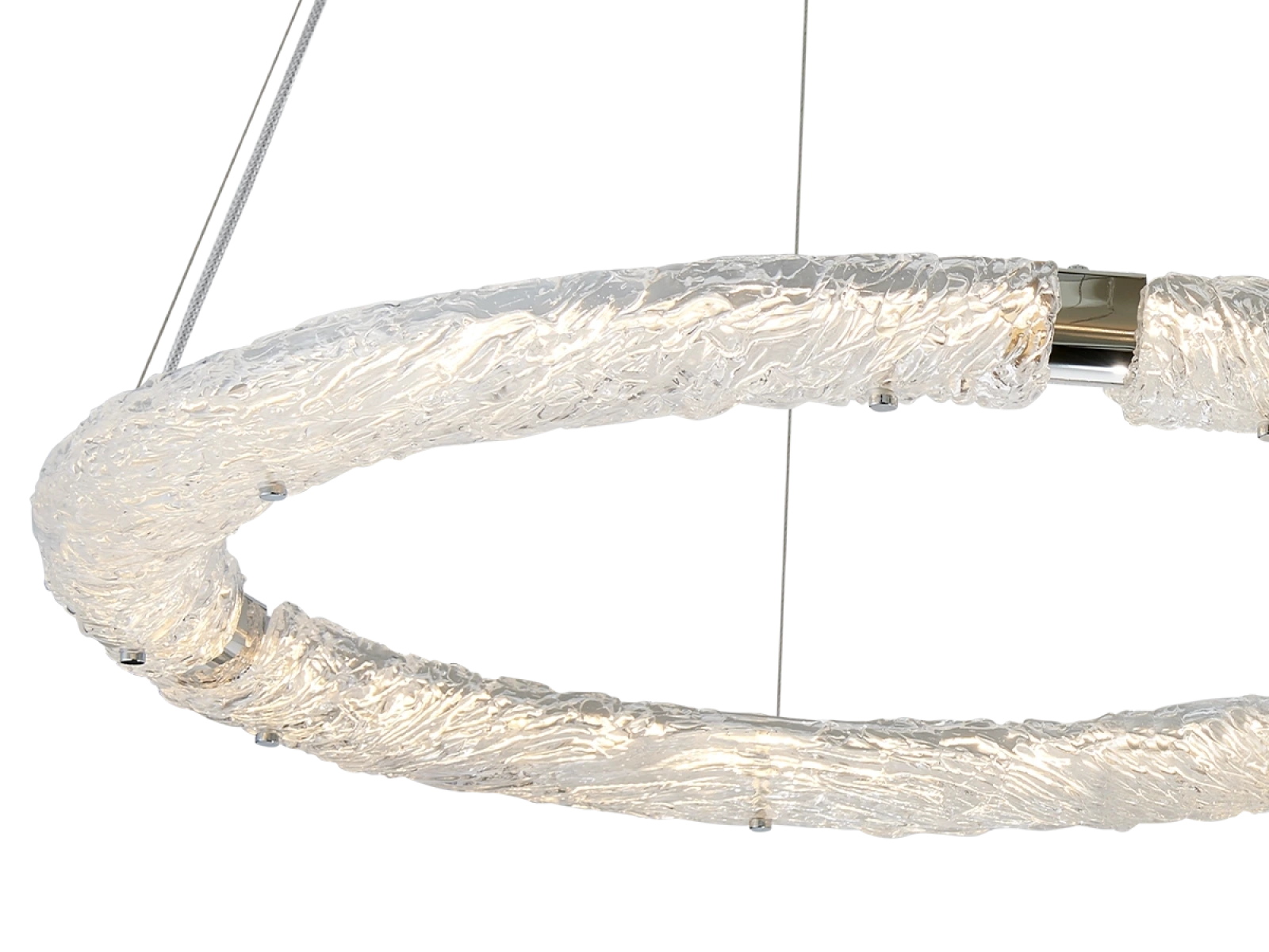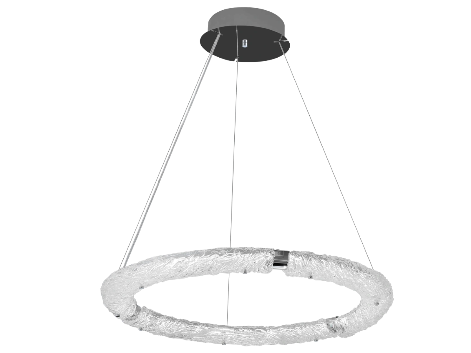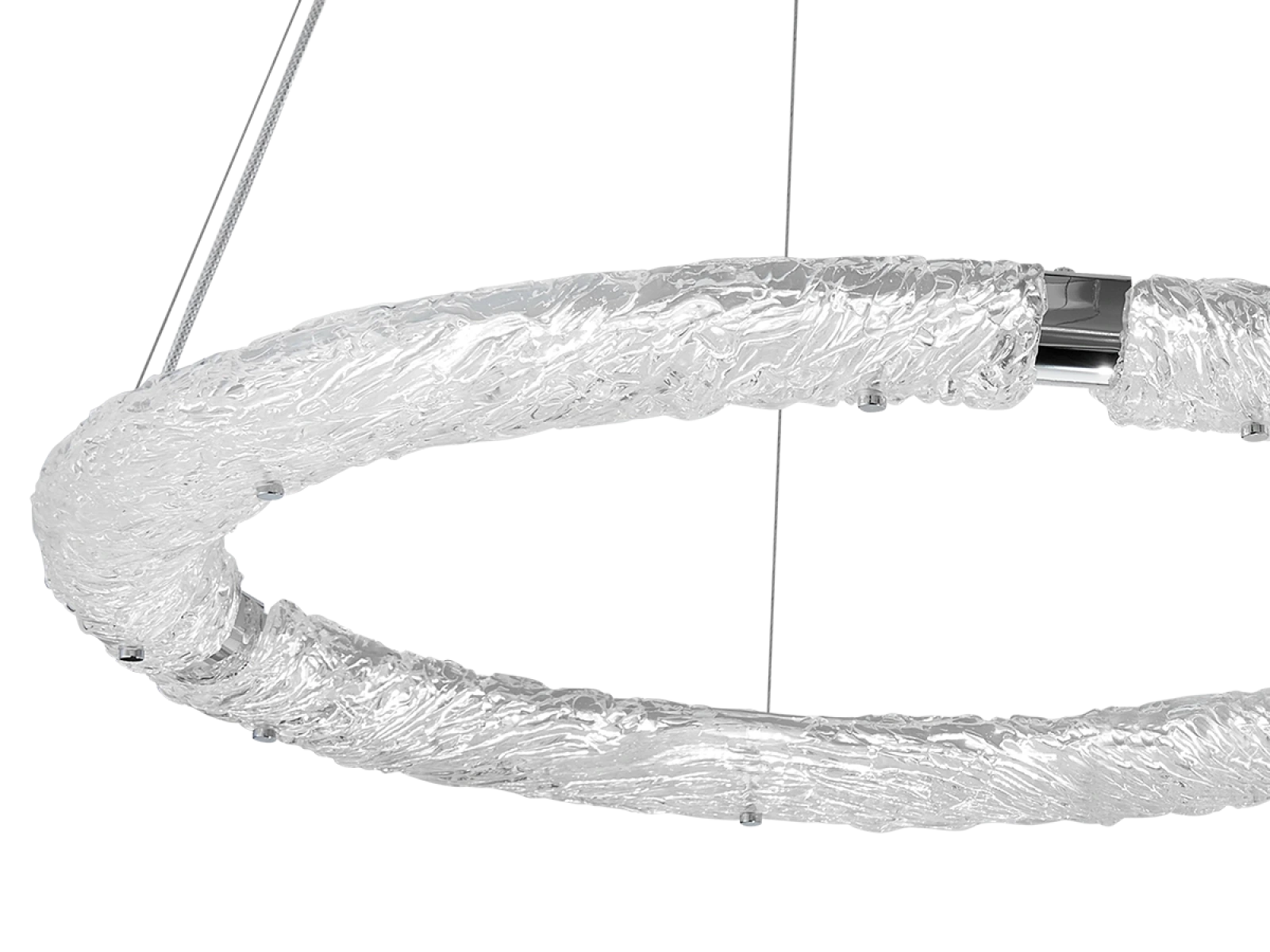 Svietidlo je vyrobené z vysokokvalitného nerezového kovu s chrómovou povrchovou úpravou, ktorá zabezpečuje dlhodobú odolnosť, stabilitu a luxusný vzhľad. Sklenené prvky so štruktúrovaným povrchom inšpirovaným kôrou zabezpečujú rovnomerný a príjemný rozptyl svetla.