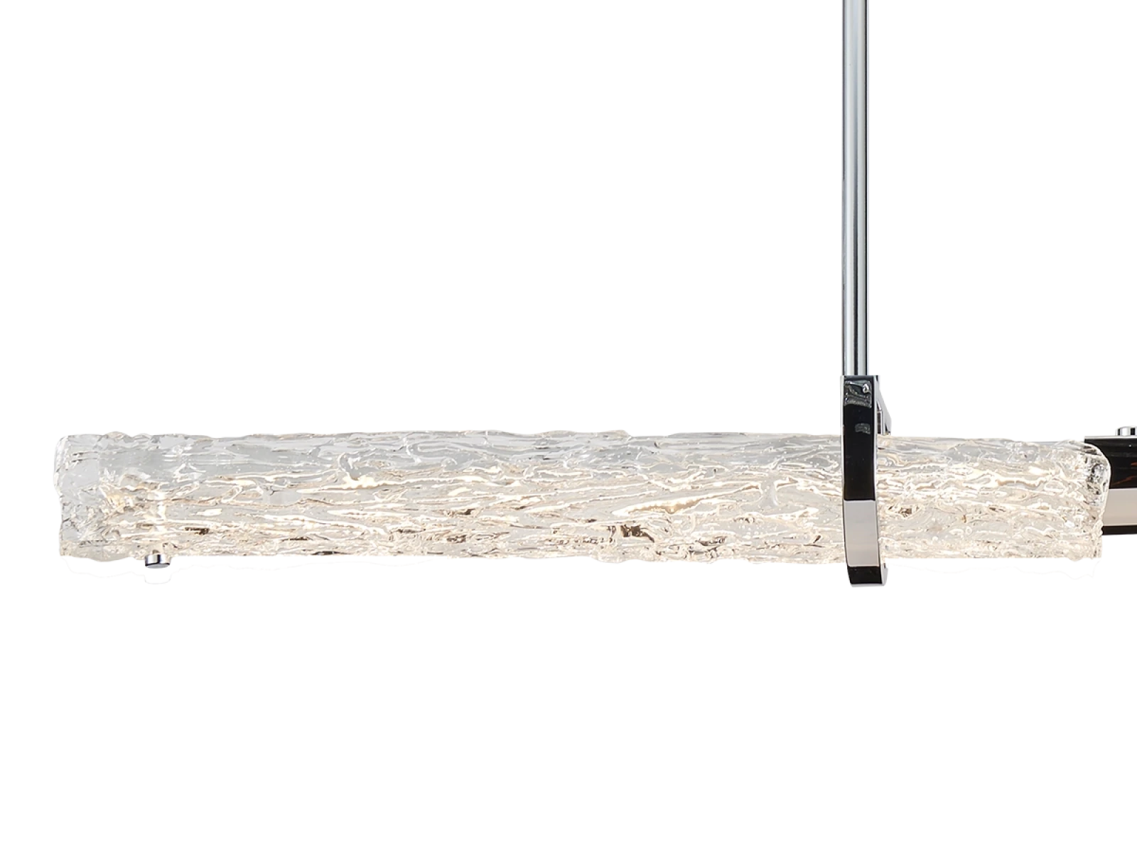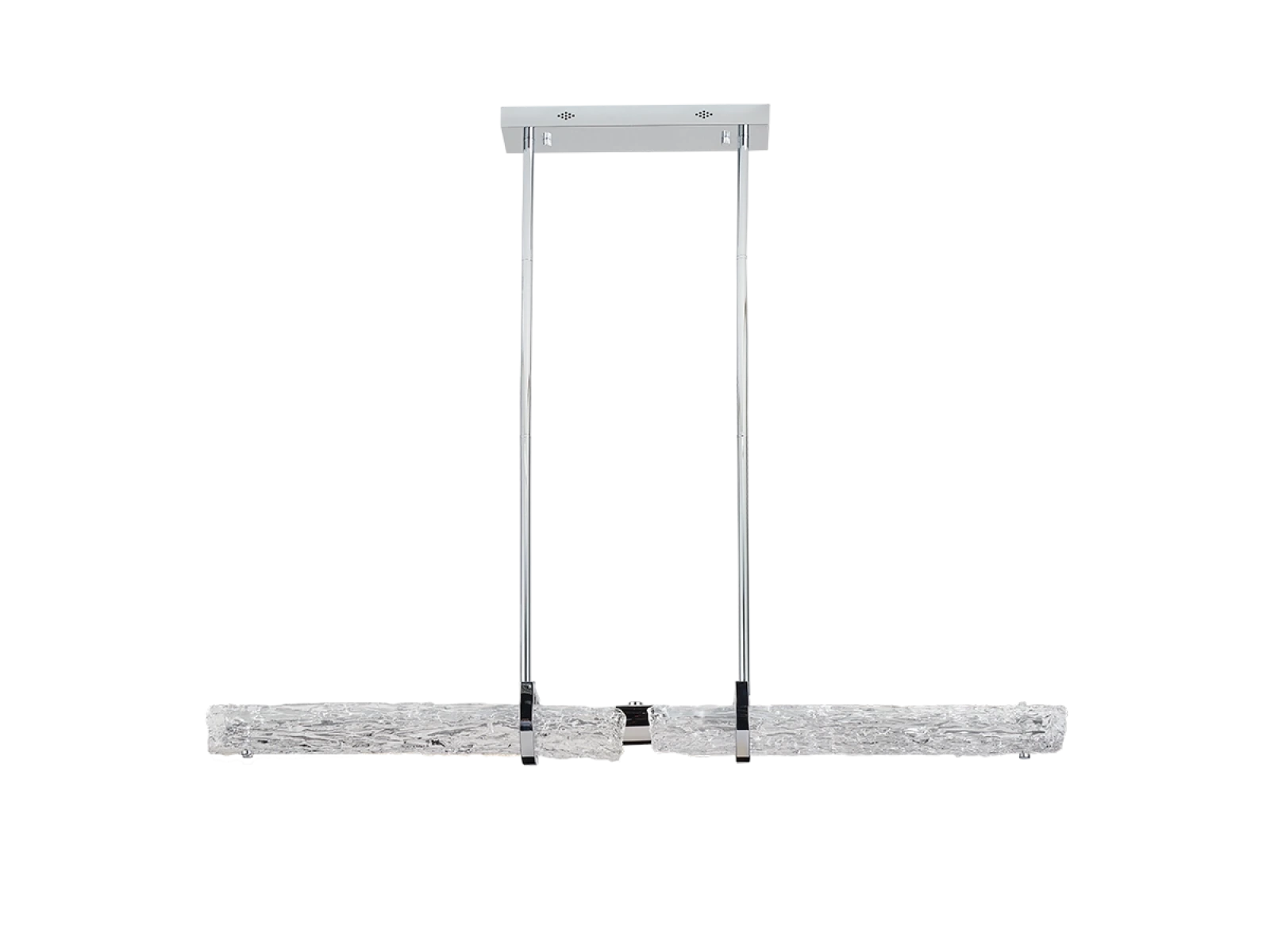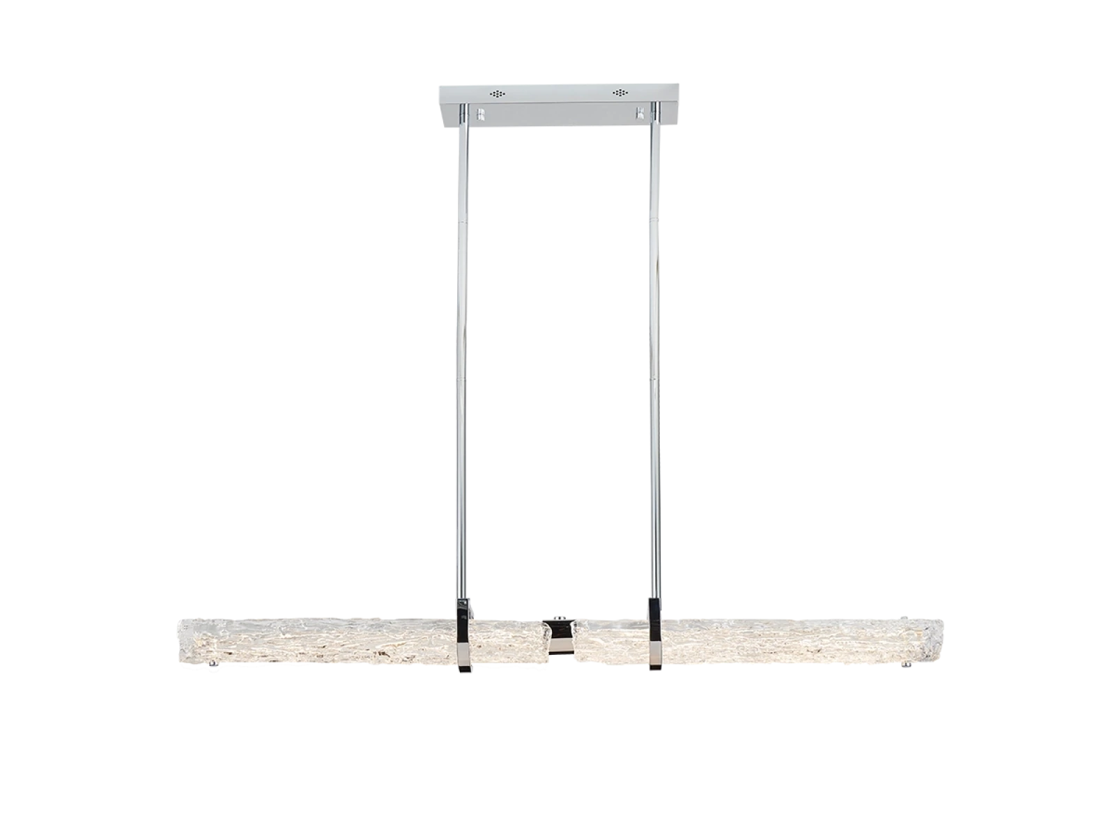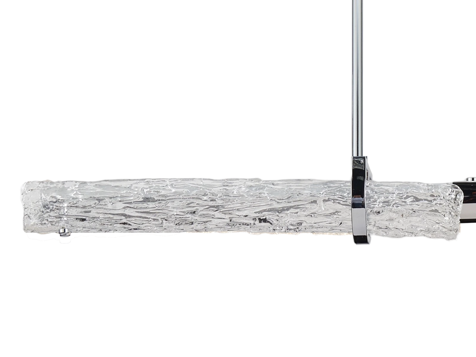 Svietidlo je vyrobené z vysokokvalitného nerezového kovu s chrómovou povrchovou úpravou, ktorá zabezpečuje dlhodobú odolnosť, stabilitu a luxusný vzhľad. Sklenené prvky so štruktúrovaným povrchom inšpirovaným kôrou zabezpečujú rovnomerný a príjemný rozptyl svetla.