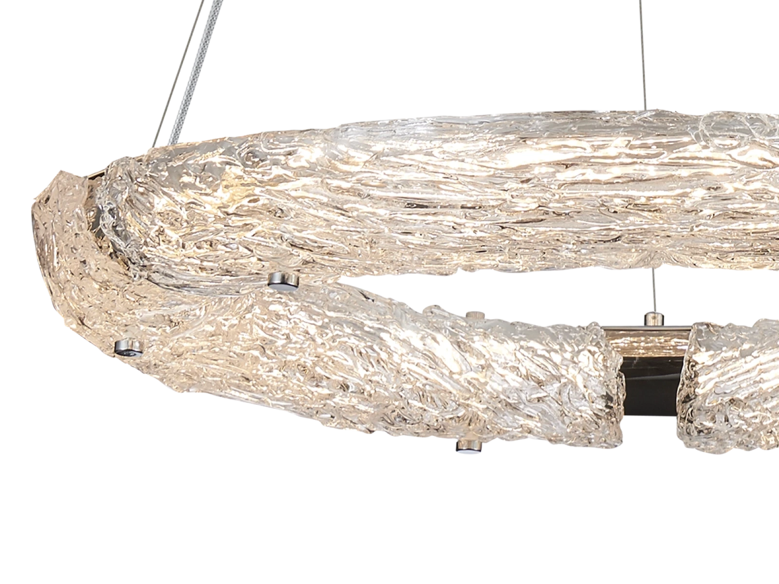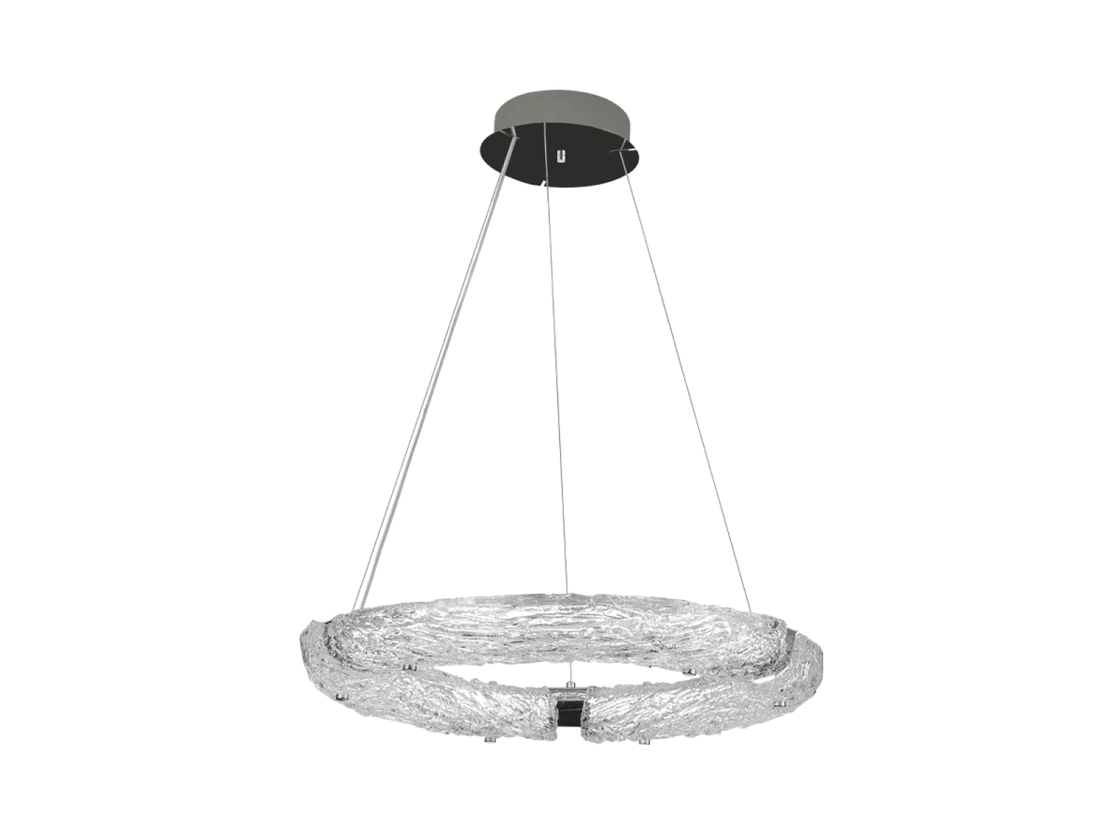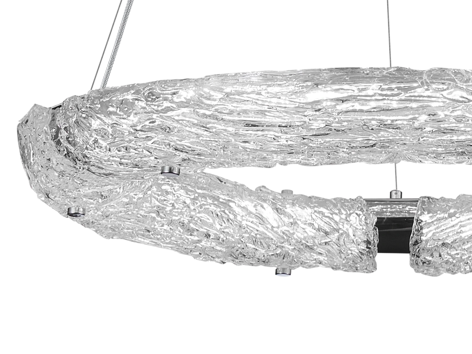 Svietidlo je vyrobené z vysokokvalitného nerezového kovu s chrómovou povrchovou úpravou, ktorá zabezpečuje dlhodobú odolnosť, stabilitu a luxusný vzhľad. Sklenené prvky so štruktúrovaným povrchom inšpirovaným kôrou zabezpečujú rovnomerný a príjemný rozptyl svetla.