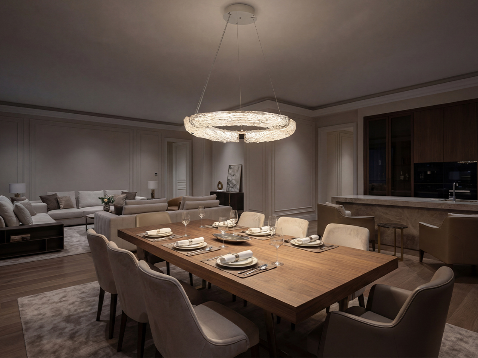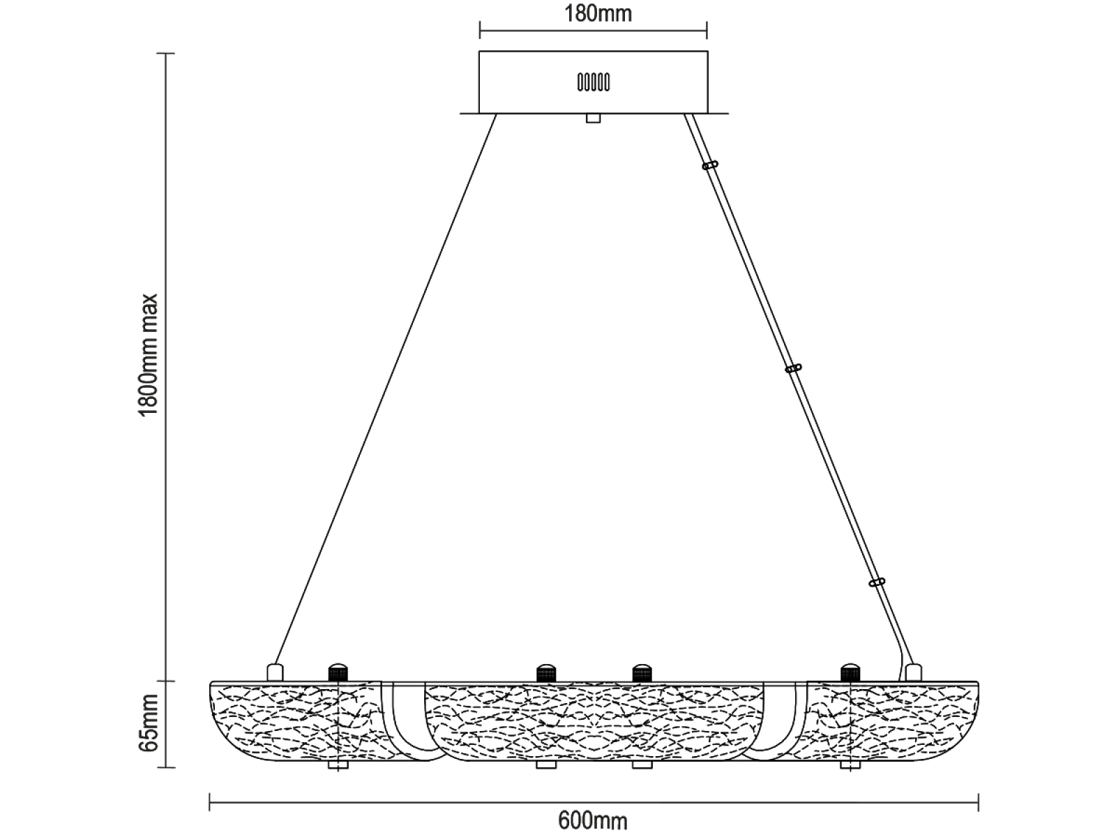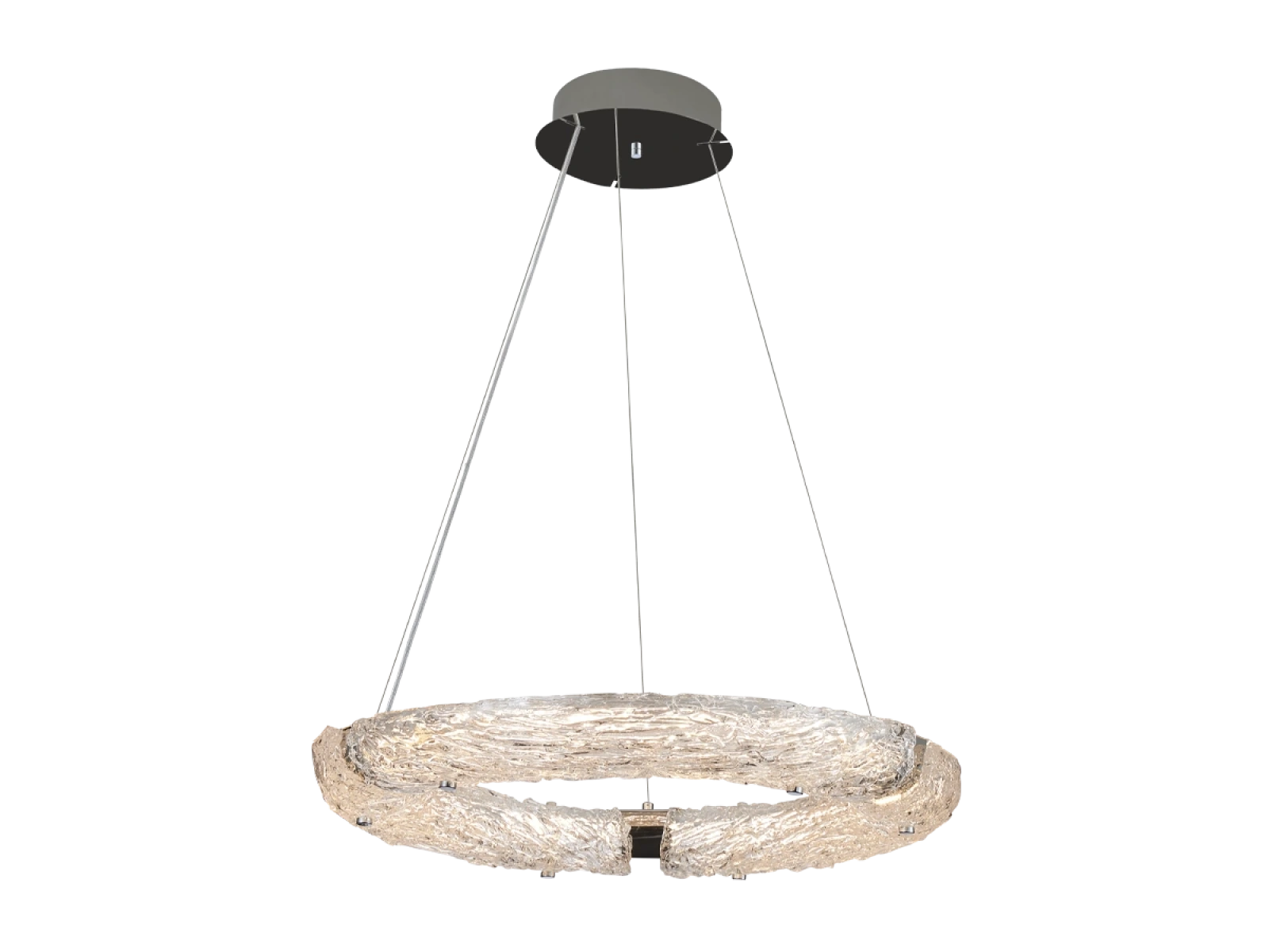 Svietidlo je vyrobené z vysokokvalitného nerezového kovu s chrómovou povrchovou úpravou, ktorá zabezpečuje dlhodobú odolnosť, stabilitu a luxusný vzhľad. Sklenené prvky so štruktúrovaným povrchom inšpirovaným kôrou zabezpečujú rovnomerný a príjemný rozptyl svetla.