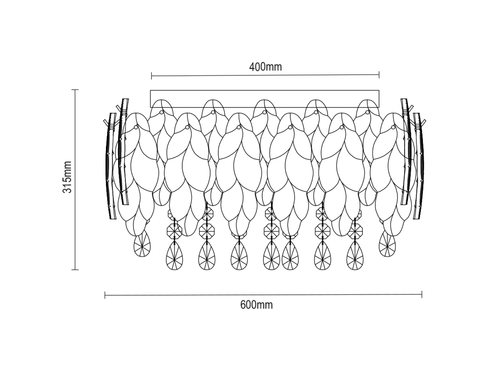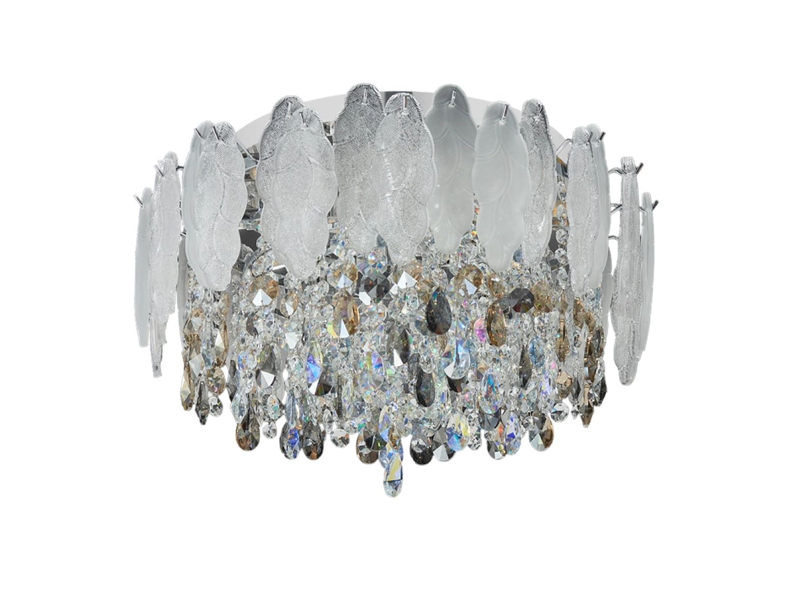 Kovová konštrukcia v kvalitnej povrchovej úprave je doplnená o sklenené a brúsené kryštálové prvky, ktoré jemne rozptyľujú svetlo a vytvárajú decentný svetelný efekt. Svietidlo pôsobí vkusne a nadčasovo, s dôrazom na detail a kvalitné spracovanie.