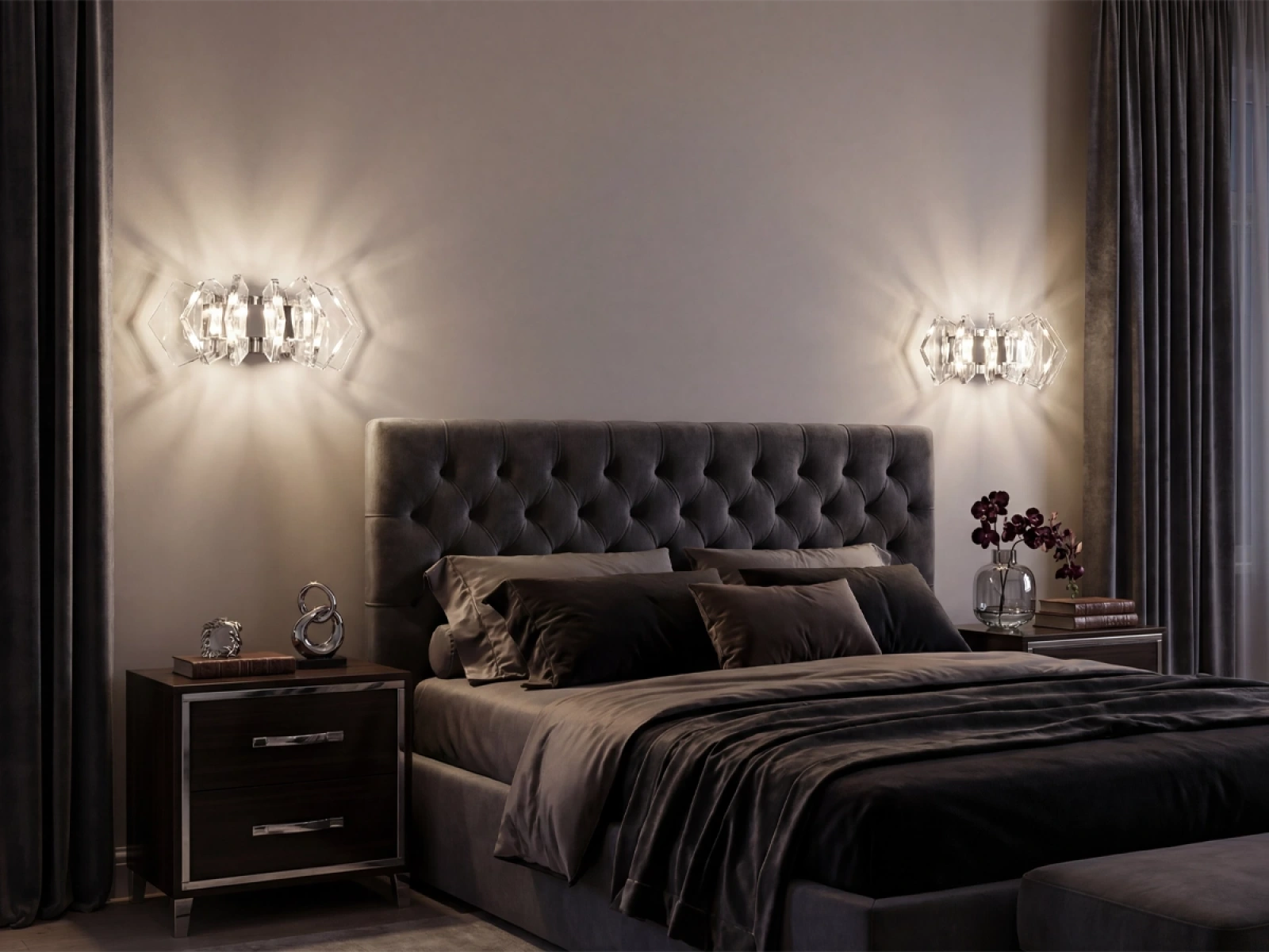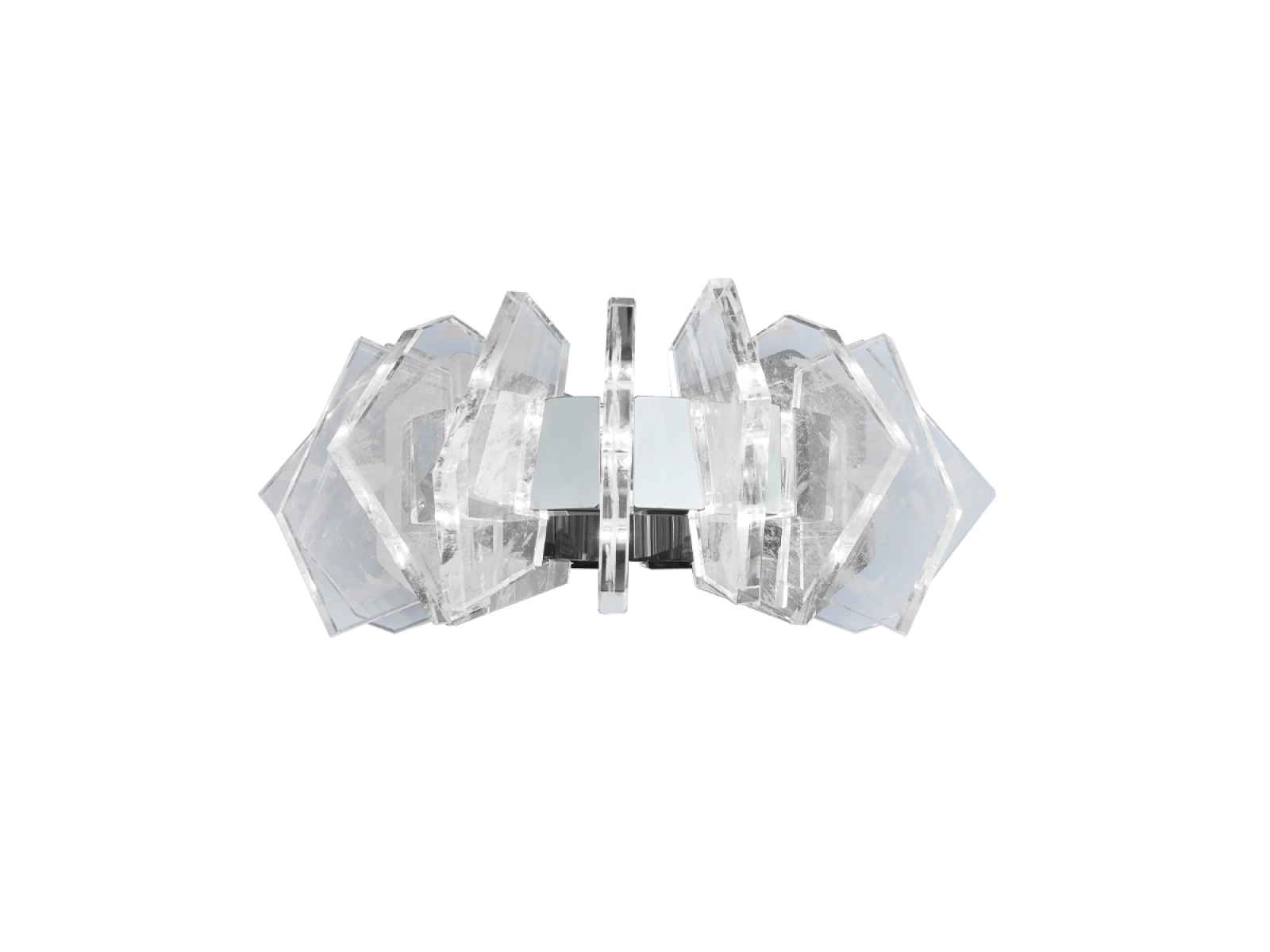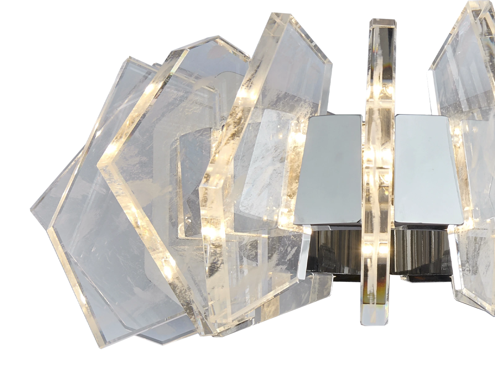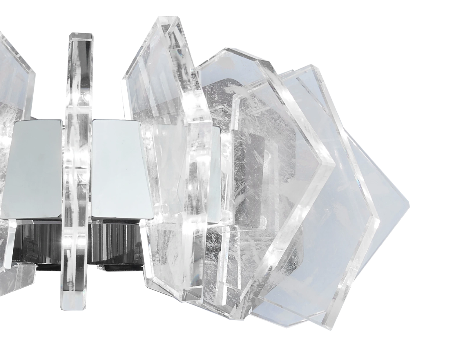 Konštrukcia je vyrobená z kvalitnej ocele s chrómovou povrchovou úpravou a doplnená o originálne usporiadané, precízne brúsené krištáľové prvky, ktoré zabezpečujú intenzívny lom a odraz svetla. Výsledkom je luxusná svetelná atmosféra s výrazným dekoratívnym efektom, ktorá podčiarkne charakter moderného aj reprezentatívneho interiéru.