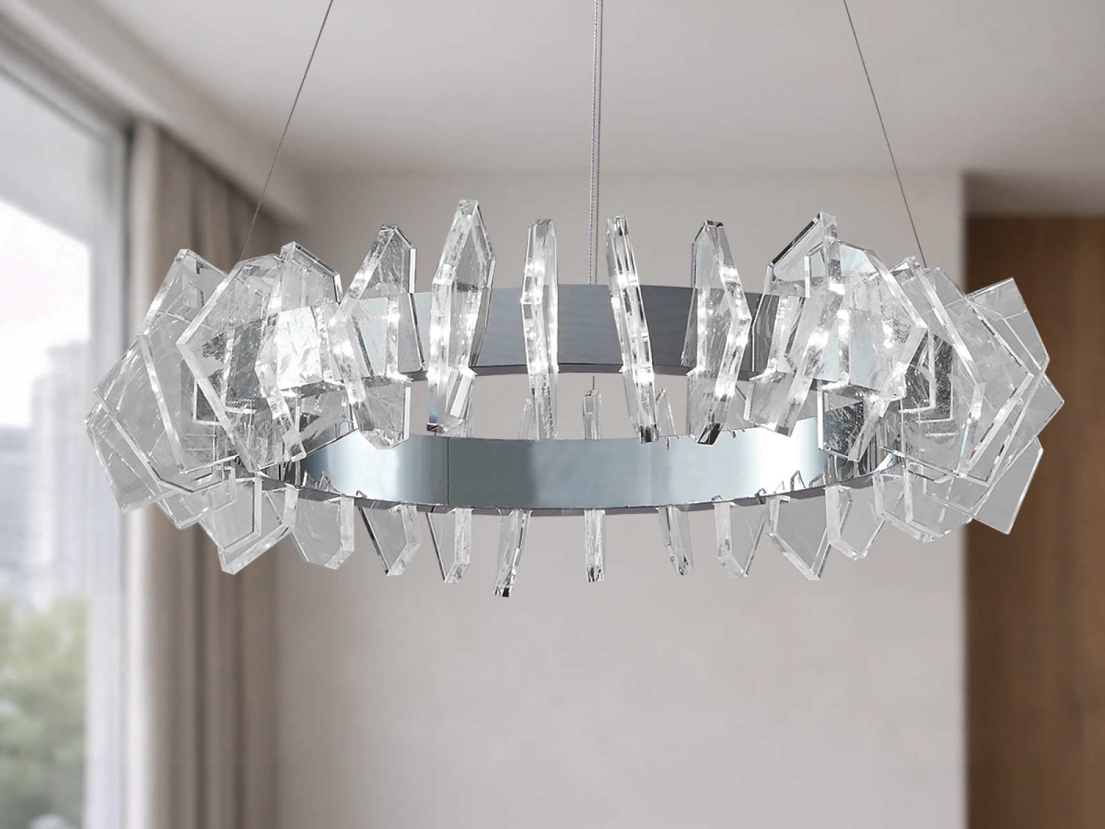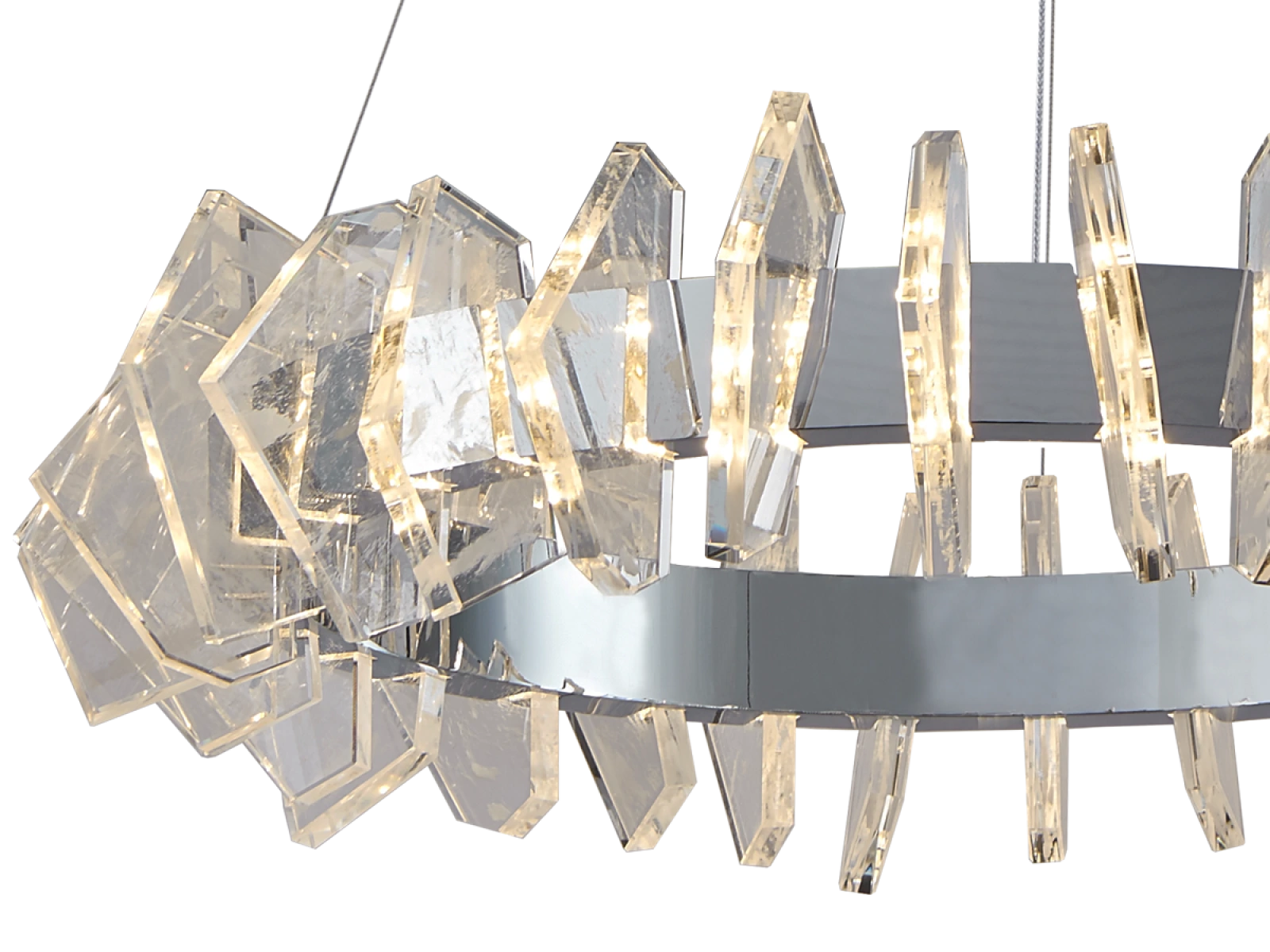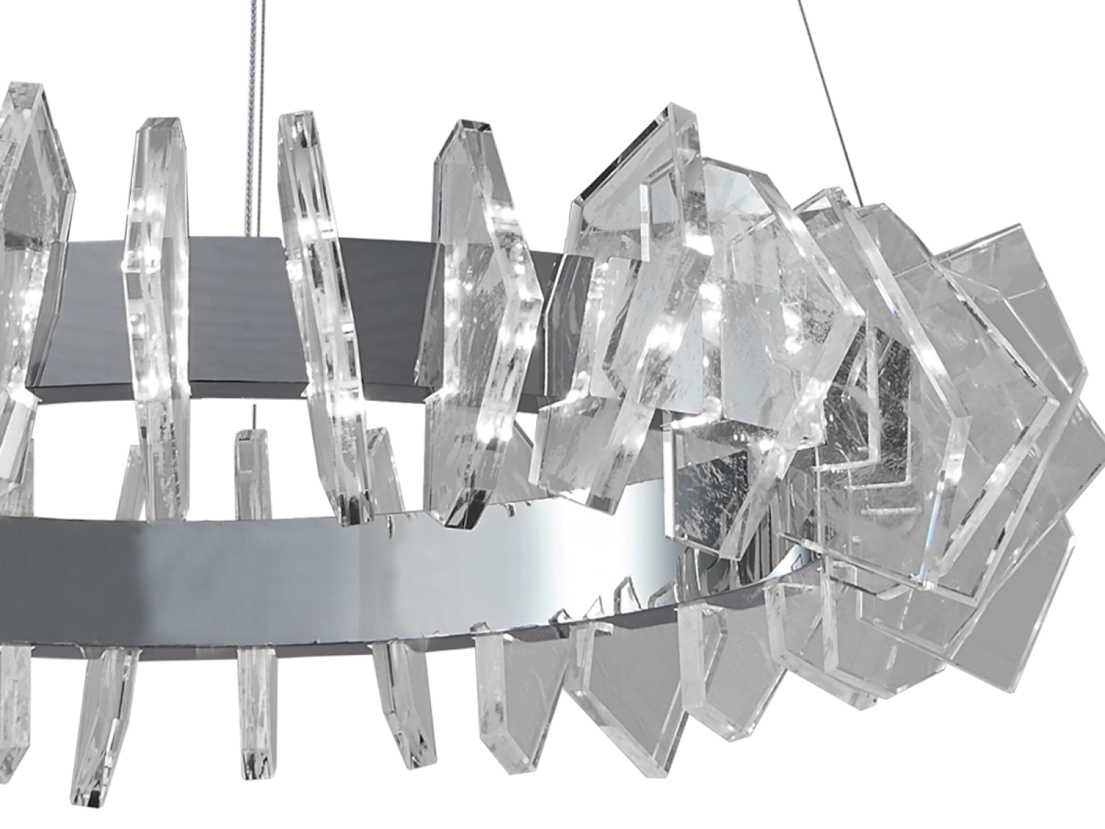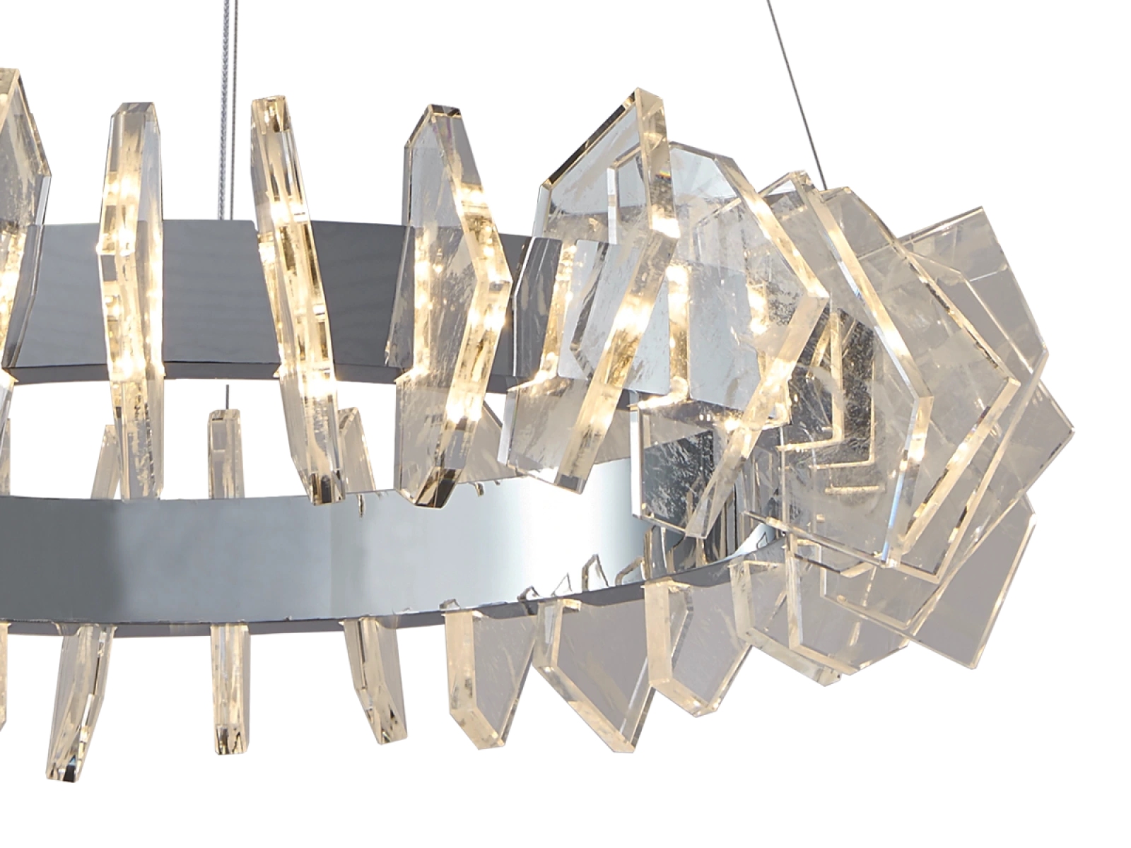 Konštrukcia je vyrobená z kvalitnej ocele s chrómovou povrchovou úpravou a doplnená o originálne usporiadané, precízne brúsené krištáľové prvky, ktoré zabezpečujú intenzívny lom a odraz svetla. Výsledkom je luxusná svetelná atmosféra s výrazným dekoratívnym efektom, ktorá podčiarkne charakter moderného aj reprezentatívneho interiéru.