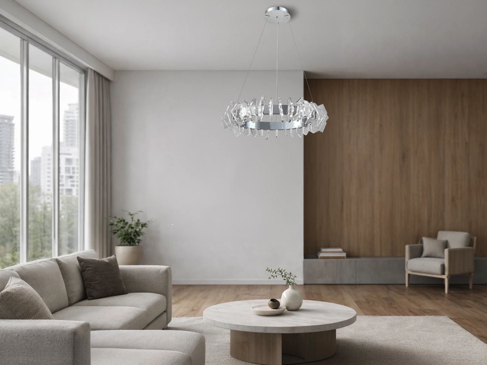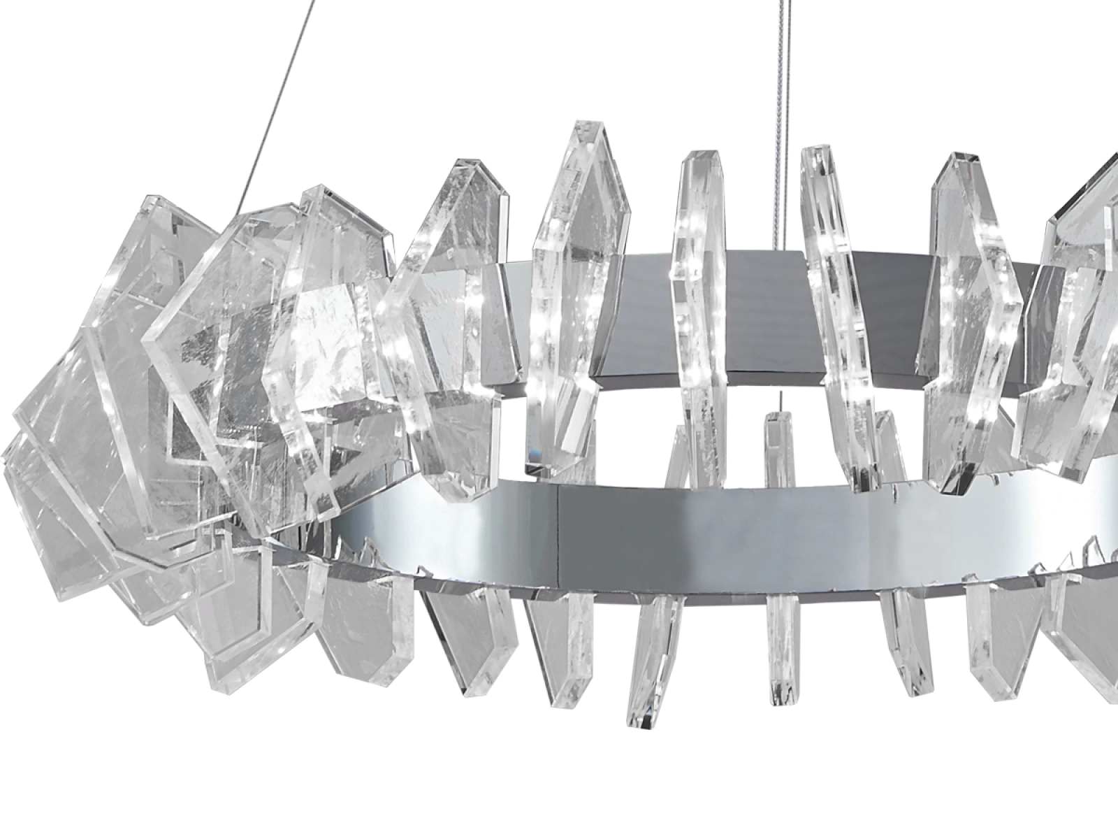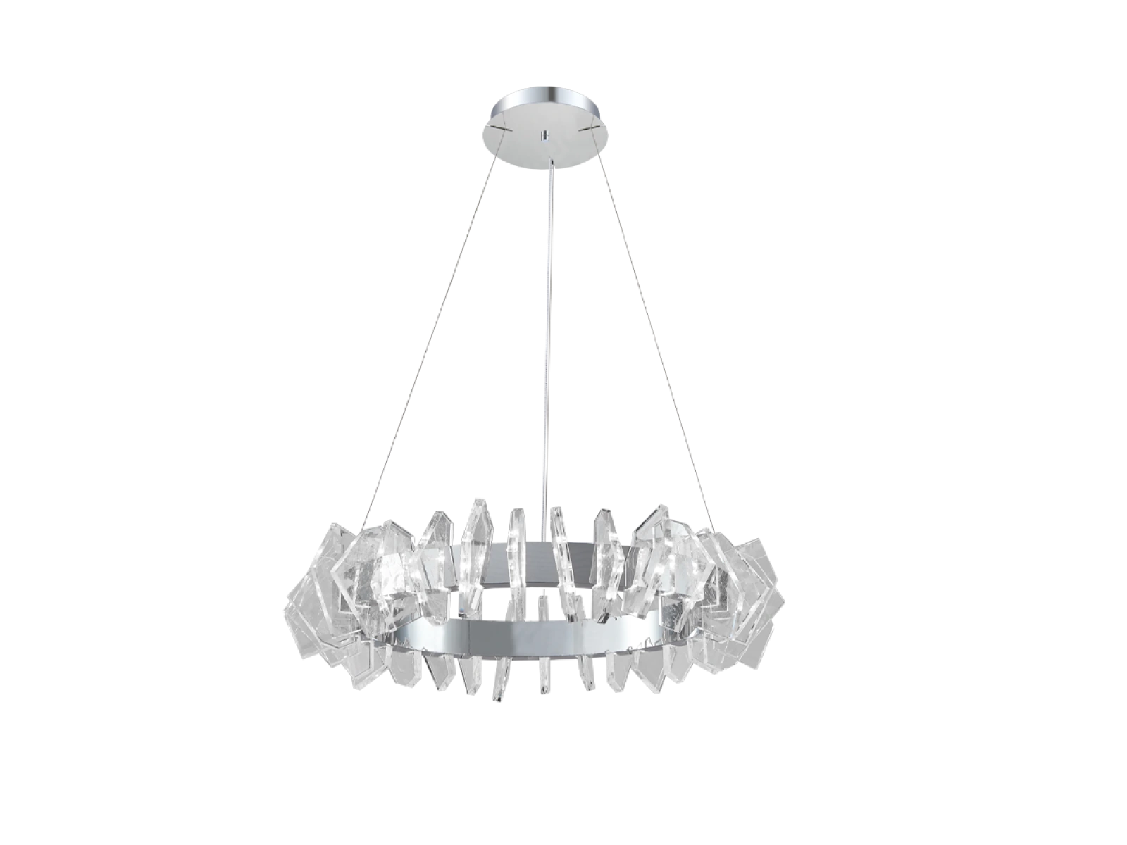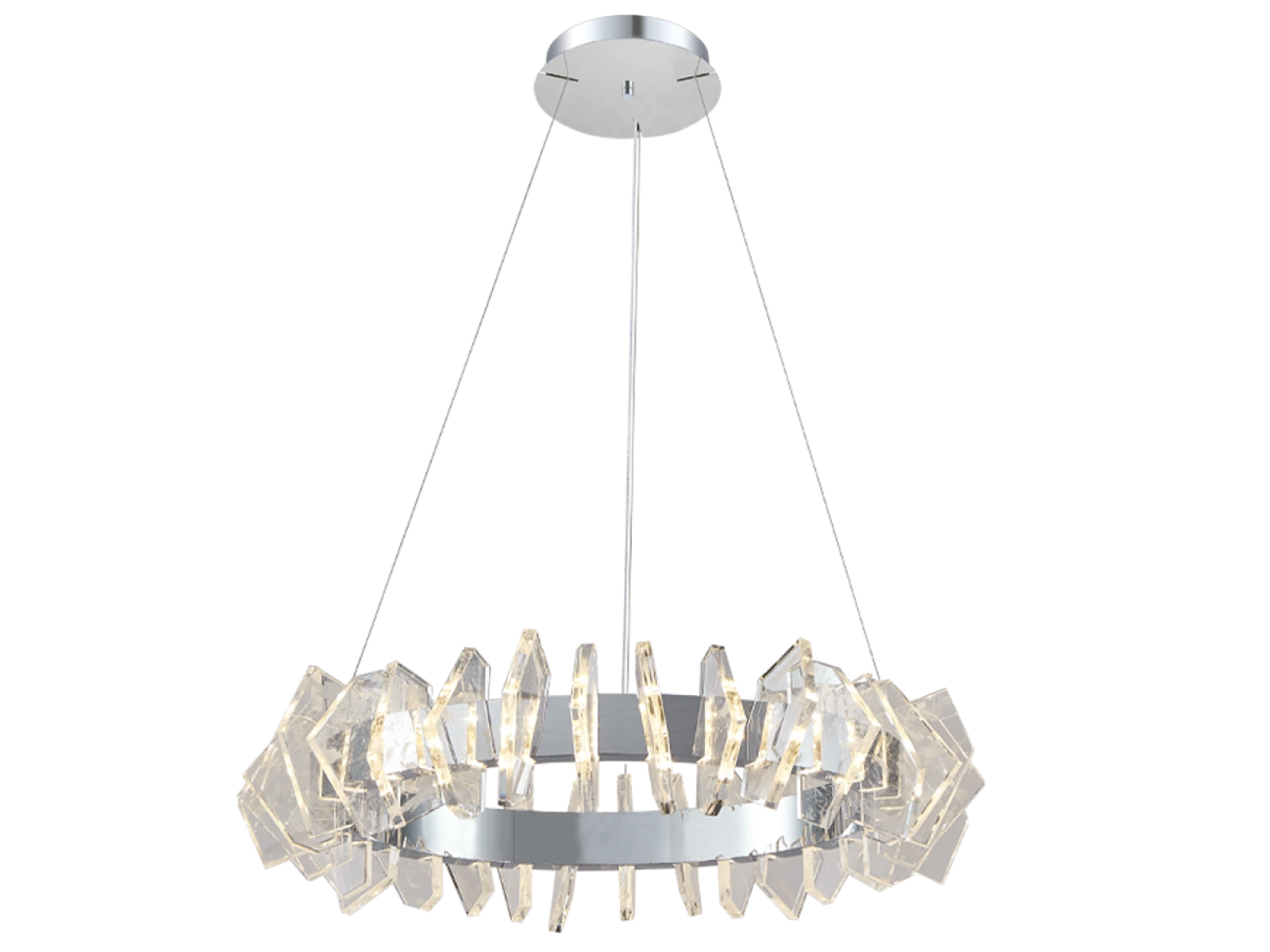 Konštrukcia je vyrobená z kvalitnej ocele s chrómovou povrchovou úpravou a doplnená o originálne usporiadané, precízne brúsené krištáľové prvky, ktoré zabezpečujú intenzívny lom a odraz svetla. Výsledkom je luxusná svetelná atmosféra s výrazným dekoratívnym efektom, ktorá podčiarkne charakter moderného aj reprezentatívneho interiéru.